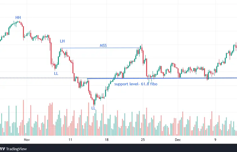 Market Structure Shift (MSS): A market structure shift occurs when the price transitions from one trend to another. In this case, gold prices broke above a lower high (LH), closing beyond it and signaling a potential shift to a bullish trend. This move was followed by a pullback to the 61.8% Fibonacci retracement level, a key area of confluence where price found support. Buyers stepped in, pushing prices higher.
